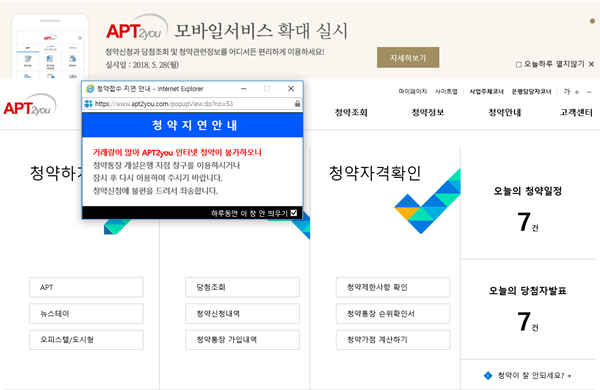 아파트투유는 곧장 청약 신청자들에게 업무 지연을 알렸다. 팝업 안내를 통해 "거래량이 많아 아파트투유 인터넷 청약이 불가하다"면서 "청약통장 개설은행 지점 창구를 이용하거나 잠시 후 다시 이용해 주기 바란다"고 공지했다.