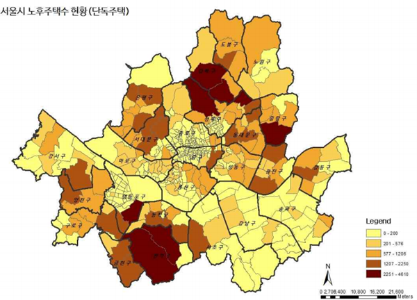 노후 단독주택수를 기준으로 한 쟁점지역은 주로 서울 변두리 지역에, 노후주택비율이 높게 나타나는 지역은 주로 서울 구도심 지역에 집중 분포하는 것으로 파악됐다.