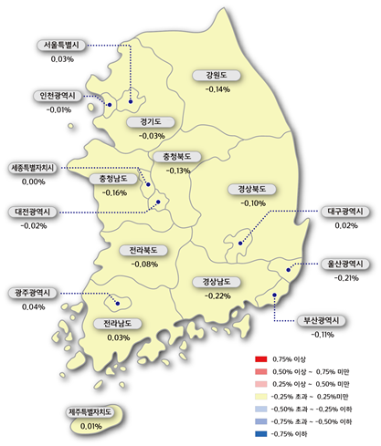 수도권은 서울 0.03% 상승, 경기 0.03% 하락, 인천 0.01% 하락 등에 힘입어 0.01% 하락했다. 지방의 아파트 매매가격도 0.09% 떨어졌다.