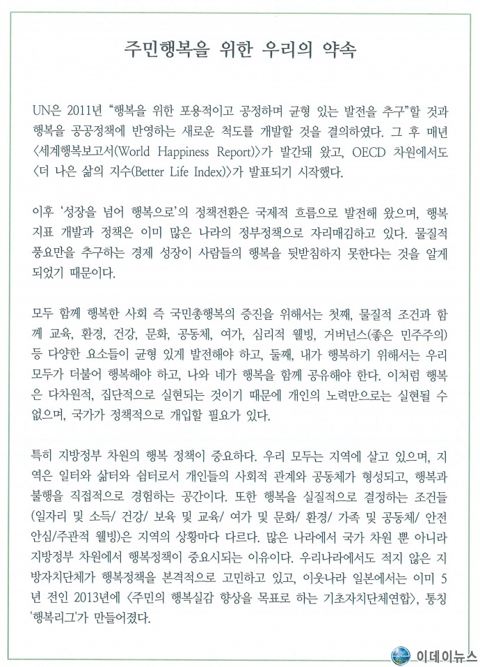 1. 우리는 개발주의와 양적 성장주의를 지양하고, 주민 행복을 최우선 정책 목표로 한다. 이로써 더불어 행복한 지역공동체를 추구한다.