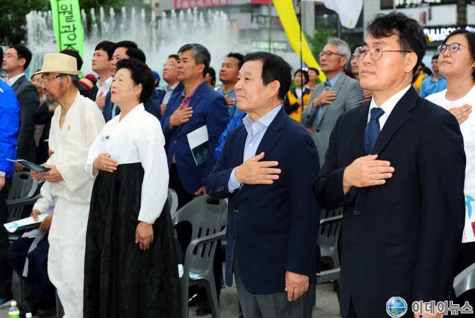윤장현 광주광역시장이 10일 오후 동구 5·18 민주광장에서 열린 ‘6월 민주항쟁 제31주년 기념식’에 참석해 국민의례를 하고 있다.