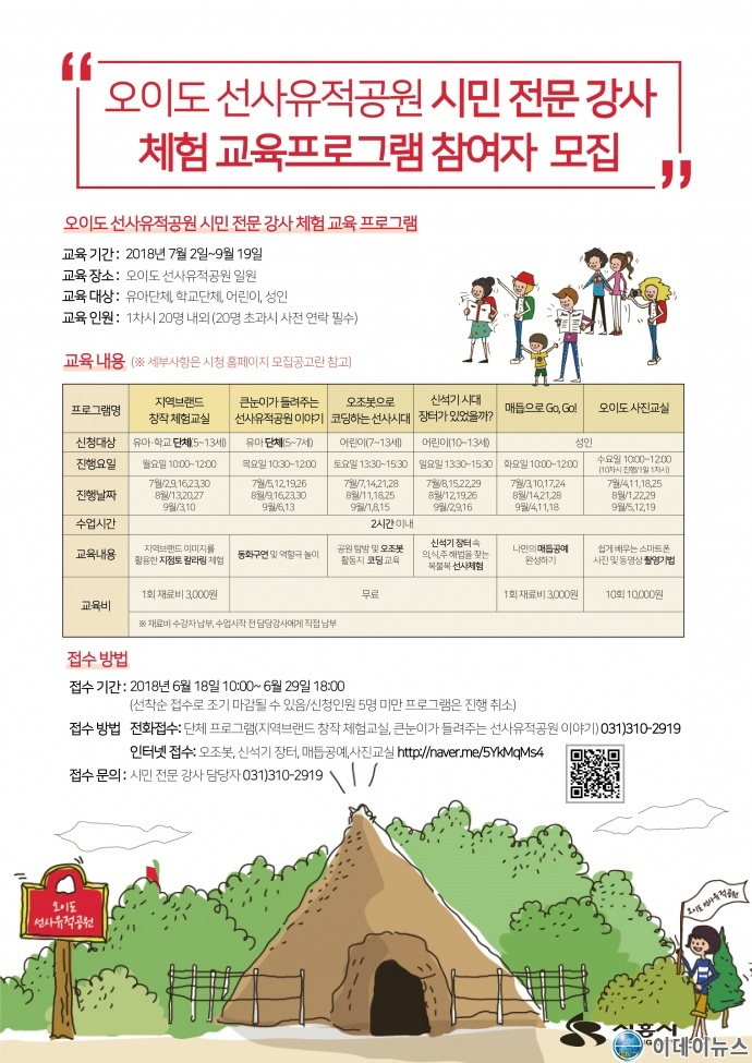 체험교육프로그램은 오이도선사유적공원과 연계된 신석기 장터놀이, 동화구연, 지역브랜드 칼라링, 사진교실, 매듭공예, 오조봇 코딩교육 등 총 6종으로 운영되며 유아부터 성인까지 모두가 참여할 수 있는 프로그램들로 구성되었다.