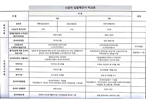아울러 공사기간은 계룡건설-한진중공업 컨소시엄이 착공 후 30개월, 모아종합건설도 역시 착공 후 30개월 이내를 제시해 차이가 없었다.