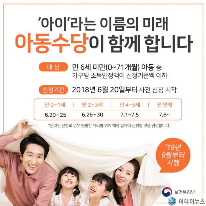 아동수당은 아동양육에 따른 경제적 부담을 경감하기 위해 정부가 지원하는 제도다.소득 하위 90% 가구를 대상으로 만 6세 미만 아동 1인당 월 10만 원씩 지급된다. 오는 9월 지급 시 2012년 10월 이후 출생자가 해당되며 4인 가구 소득인정액은 월 1,436만 원 이하다.