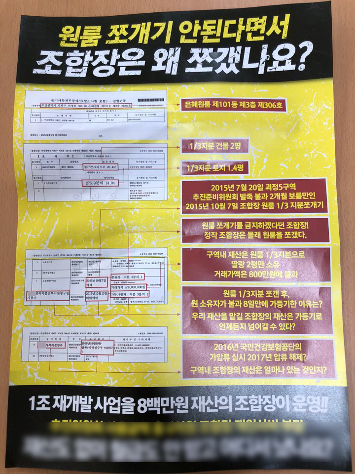 이곳은 현재 ▲지방선거 개입설 ▲3억 원 수수 의혹 ▲포스코건설 유찰설로 구역이 시끄러워지고 있는 가운데 최근 발신인 불명의 찌라시가 뿌려졌다.