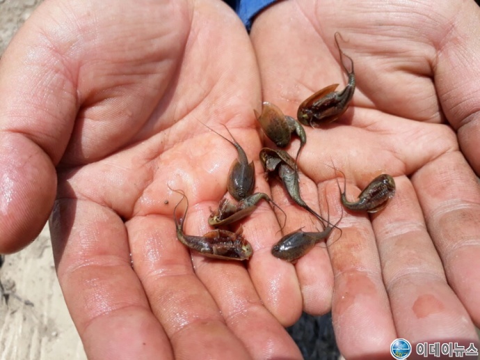 강진군 학명리 초동마을 박정웅씨의 친환경 벼 재배단지 일대에서 긴꼬리투구새우의 대량 서식이 확인됐다.