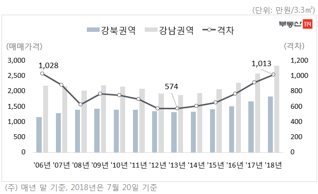 강남ㆍ강북의 아파트값은 약 12년 전인 2006년에 가장 크게 차이가 났다. 2006년 말 기준 강남권역은 3.3㎡당 평균 2182만 원, 강북권역은 1154만 원으로 격차가 1028만 원까지 벌어졌다. 2008년 글로벌 금융위기 이후 강남권역 아파트값 낙폭이 두드러졌고, 2013년 말에는 강남 1880만 원, 강북 1306만 원으로 격차가 절반 수준인 574만 원까지 좁혀졌다.