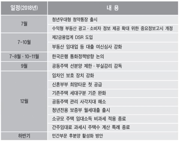 지난달(6월) 29일 나온 `2018년 주거종합계획`에 따라 임대차시장의 투명성ㆍ안정성을 높이고 임차인 권리를 보호할 방안을 올해 안에 마련한다. 우선 올해 하반기 `임대료 증액기준 합리화` 방안으로 임대료 증액 현황 실태조사(현재 연 5%) 및 증액기준 개선 방안 연구를 통해 합리적인 임대료 증액기준을 마련한다. 또 오는 12월 「주택임대차보호법」 개정을 통해 임대차계약 갱신거절 통지기간을 `계약 만료 1개월 전`에서 `2개월 전`으로 변경한다. 동법 시행령을 개정해 다른 담보물권자보다 우선 변제받을 수 있는 최우선 변제 소액보증금을 상향할 예정이다.