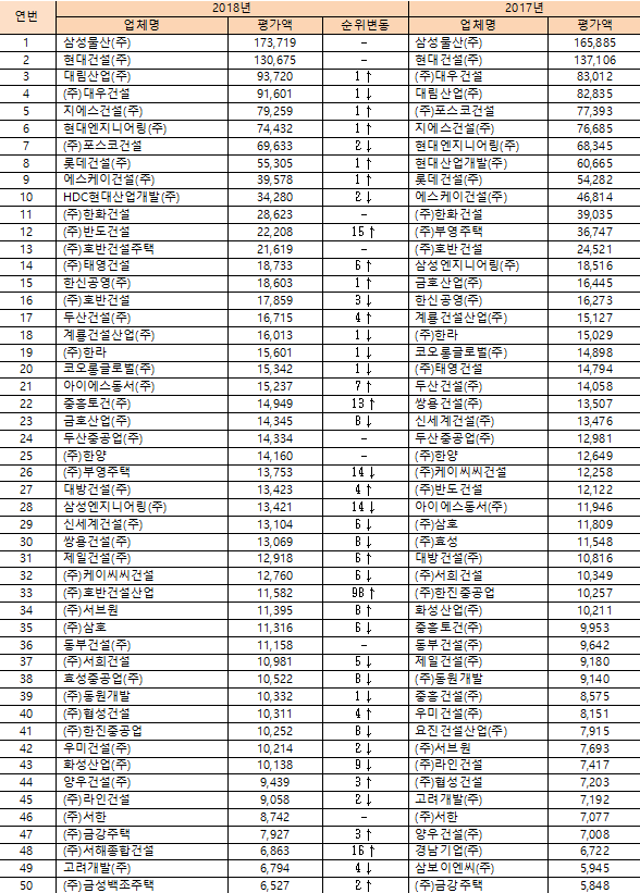 5위와 6위는 GS건설과 현대엔지니어링으로 지난해보다 한 계단씩 상승했다. 5위였던 포스코건설은 시공능력 평가액이 7조7393억 원에서 6조9633억 원으로 떨어지면서 7위로 떨어졌다. 롯데건설과 SK건설이 각각 한 계단씩 올라가며 8위와 9위에 포진했다. 작년 8위였던 현대산업개발은 10위로 내려갔다.