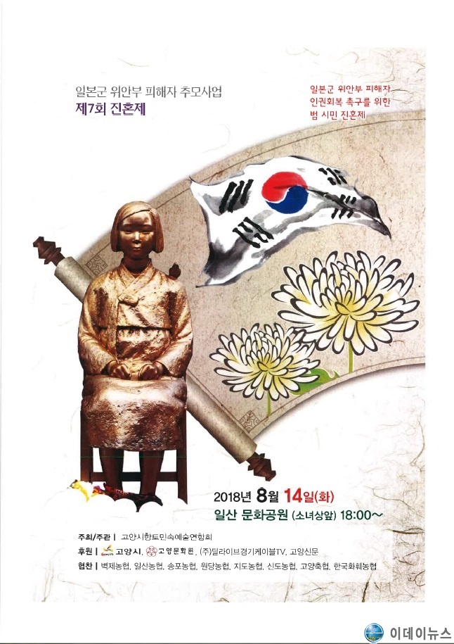 고양시(시장 이재준)는 오는 8월 14일 일산문화공원 소녀상 앞에서 일본군 위안부 피해자 인권회복 촉구를 위한 추모행사 ‘제7회 진혼제’를 개최한다.