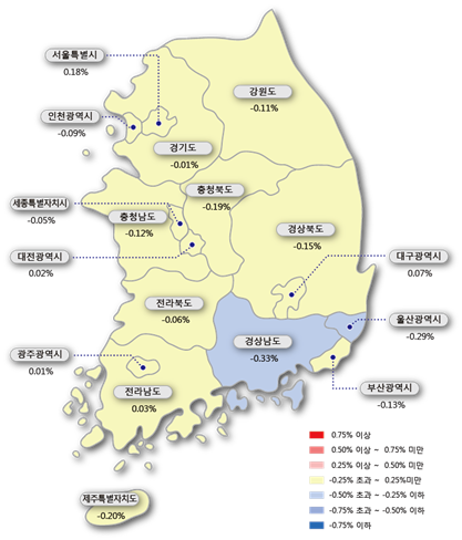 지방(-0.11%→-0.11%)은, 5대 광역시(-0.07%→-0.06%), 8개도(-0.15%→-0.16%), 세종(0.00%→-0.05%) 등에 영향으로 지난주 하락폭 유지했다.