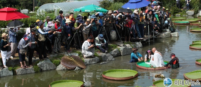 연이은 폭염을 식혀준 단비가 지나간 지난 11일 전남 강진군 군동면 남미륵사 주지 법흥스님이 연(蓮)방죽의 빅토리아 연잎 위에 올라 앉아 퍼포먼스를 펼치고 있다.