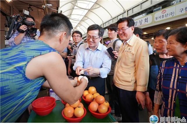 지난 14일(화) 오후, 유덕열 동대문구청장과 김동연 경제부총리 겸 기획재정부 장관이 서울의 대표적 전통시장인 청량리청과물시장을 방문했다.