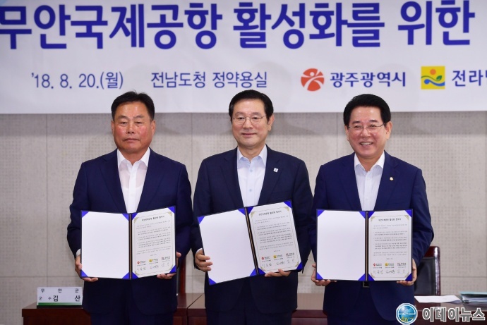 이용섭 광주광역시장과 김영록 전남도지사, 김산 무안군수는 20일 광주·전남 상생발전위원회 개최에 앞서 전남도청에서 무안국제공항 활성화를 위한 MOU를 체결했다.