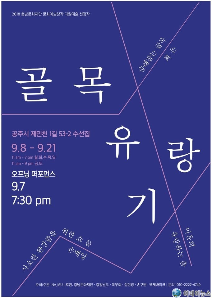 NA_MU(나舞_나無)에서 주최하여 오는 7일~21일 PM 7:30에 프로젝트 골목유량기를 무료로 충남 공주시 제민천1길 53-2 에서 대표 이윤희, 퍼포먼스 팀 오송란,강정환,정지훈,이재진,최재호, 공간디자인 손배영, 댄스필름 최은, 조연출 박혜정, 사진기록 김태영 함께 사라지거나 변해가는 골목에 대한 이야기를 펼친다.