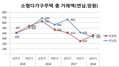 이에 따라 마포구 연남동의 다가구주택 매입 후 개조사례는 2015년 85건(905억 원)에서, 2016년 102건(1254억 원)으로 정점을 찍고 2017년 75건(1079억 원), 2018년 상반기(1~6월) 23건(331억 원)으로 다시 하향세다.