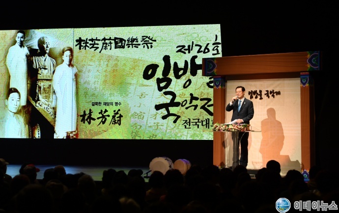 이용섭 광주광역시장이 14일 오후 동구 국립아시아문화전당 예술극장에서 열린 '제26회 임방울국악제 전국대회 전야제'에 참석해 공연장을 찾은 시민들과 인사를 나누고 이어 인사말을 했다