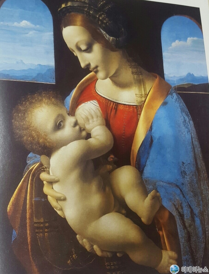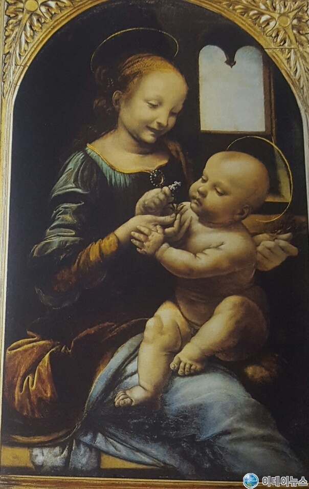 다음은 ‘리타의 성모’이다. 이 그림은 1865년에 밀라노의 안토니오 리타 공작으로부터 구입하여 그리 붙였는데, 다빈치가 1490년경에 밀라노에서 그렸다. 3)