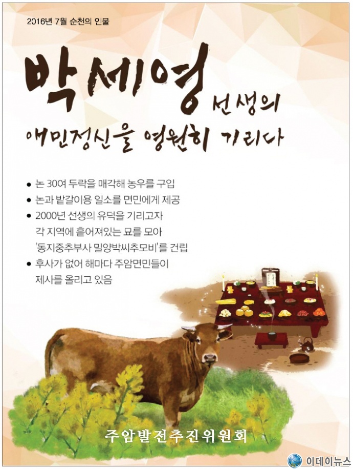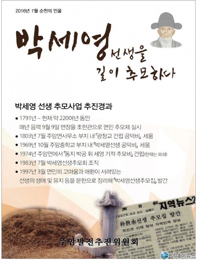지난 『2016년 7월의 순천인물』 로 선정된 『주암의 독지가 박세영(朴世永) 선생』의 제228주기 추모제가 17일(매년 음력 9월 9일) 오전 11시 순천시 주암면 행정리 산 176번지 『박세영(朴世永) 선생과 선조 합동묘지』에서 주암면민과 주암중학교 교장 및 학생 등 60여명이 참여한 가운데 추모행사가 거행 되었다.