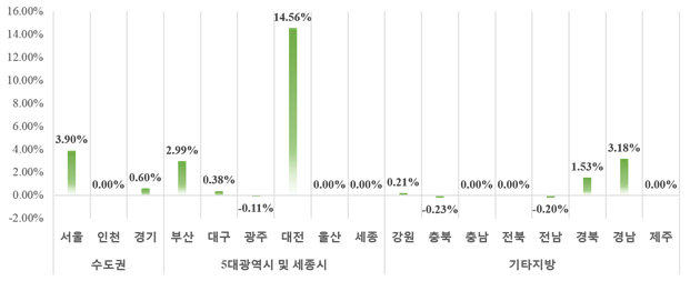전국 17개 시ㆍ도 가운데 전월대비 8개 지역은 상승, 6개 지역 보합, 3개 지역은 하락했다. 수도권은 481만 원으로 전월대비 2.03% 상승했고, 5대 광역시 및 세종시 2.81% 상승, 기타지방 0.58% 상승 등으로 나타났다.