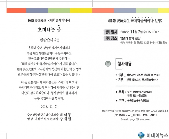 <수은 강항선생국제학술세미나 행사 버스출발 안내> 행사 당일 45인승 버스출발 장소 및 시간 안내 다음 달 11월 7일 광주향교 45인승 2대와 쌍촌동 호남대학교 정문 근처 운천역 4번출구에서 1대가 각각 1시 30분 출발. 차량 출발시간 엄수요망.
