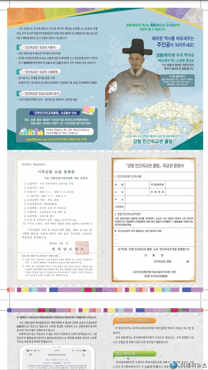 수은 강항선생기념사업회(회장 박석무)에서는 조이여행사(대표 최금환)와 손잡고 수은강항선생이 포로로 끌려간 여정을 고스란히 되살려 '수은강항로드'로 개발해 내기로 했다.