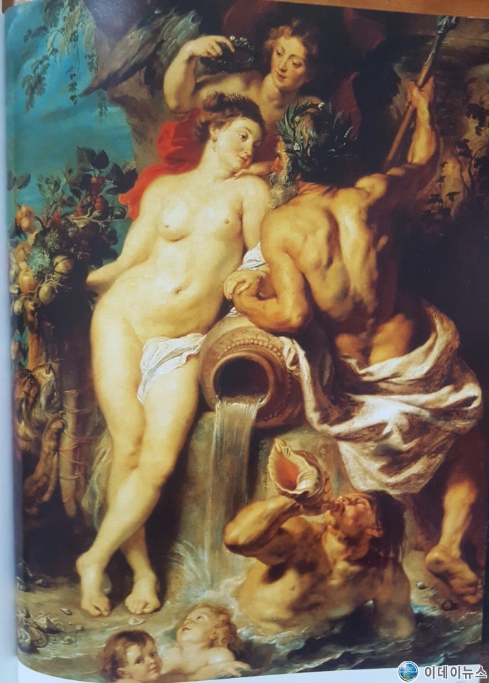 그런데 이 그림에는 ‘스헬데와 안트베르펜’이라는 부제가 붙어 있다. 당시 루벤스가 활동했던 플랑드르 도시 안트베르펜은 전쟁으로 스헬데 강을 통해 바다로 나가는 항로가 차단당했는데, 땅과 물이 만나듯이 바다로 나가 안트베르펜이 번영하길 기원하고 있다.