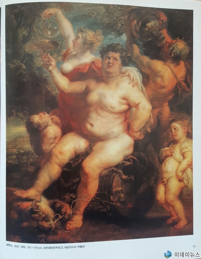 다음 그림은 ‘바쿠스(Bacchus)’이다. 바쿠스는 로마 신화의 포도주와 황홀경의 신이다. 이 그림은 ‘부어라 마셔라’이다. 술잔을 든 바쿠스는 여인이 따르는 술을 받고 있고, 그 밑에서 한 아이가 떨어지는 술을 받아 마시고 있다. 바쿠스 오른편에는 한 남자가 병나발을 불고, 아이는 오줌을 싸고 있다.