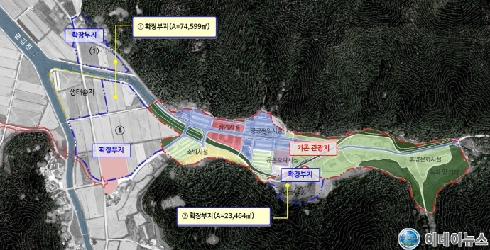 부족한 기반시설에 대한 시설을 확충하고 여가형태에 부응하는 관광지로의 재탄생을 위해 관광지 지정 및 조성계획 변경을 수립해 이를 반영하여 현재 137.517㎡의 관광지를 235,580㎡(확장98,063㎡)로 확장하는 관광지로 지정·승인된 것.