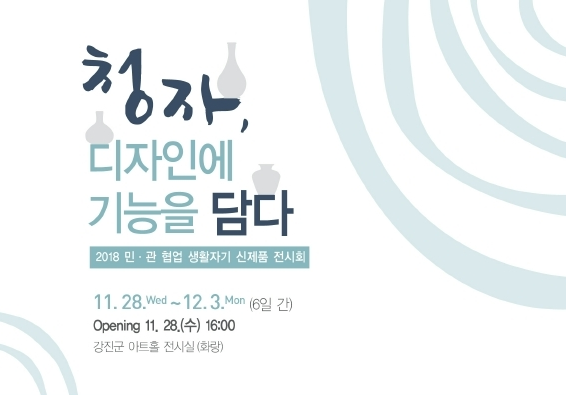 강진군 고려청자박물관은 오는 28일 오후 4시, 강진군 아트홀에서 ‘청자, 디자인에 기능을 더하다’라는 주제로 2018 민‧관 협업 생활자기 신제품 전시회 개막식을 개최한다.