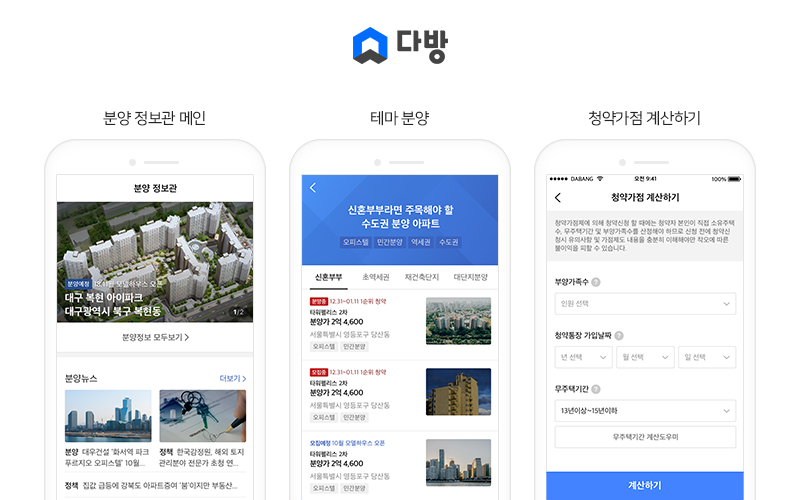 사용자는 다방 앱 내에서 아파트, 오피스텔, 도시형 생활주택 등 민간 분양 정보와 행복주택, 공공임대 등 공공 분양 정보까지 다양한 정보를 확인할 수 있으며 더 나아가 청약 가점 계산과 행복주택 입주 자격 자가 진단까지 해결할 수 있다.