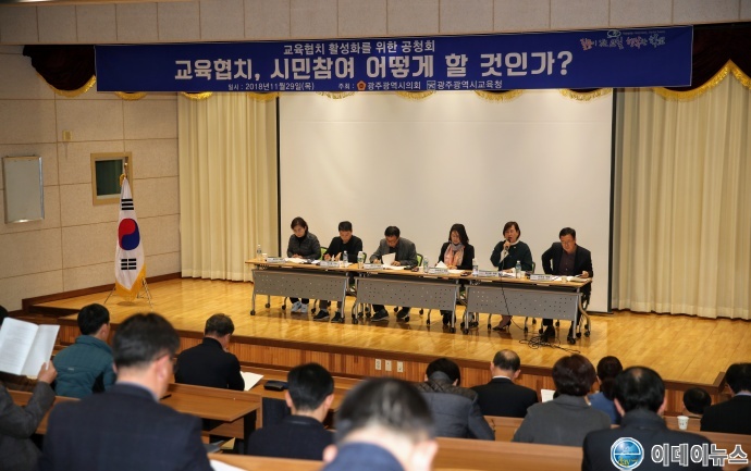 광주시의회와 광주시교육청이 주최한 '교육협치 활성화를 위한 공청회'가 29일 오후3시 광주교육연수원에서 열렸다. 이날 광주시민과 교직원, 시민단체 관계자들이 모여 '교육협치, 시민참여 어떻게 할 것인가?'를 주제로 의견을 나눴다.