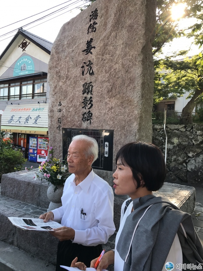 지난해 상사화가 한창이던 내산서원에서 심포지움을 끝내고 오즈시로 돌아온 지 1주일 뒤에 한국에서 26명의 단체가 오즈시를 방문하였습니다. 제가 오즈성에 있는 강항선생 현창비를 안내하였습니다. 그 단체는 영광군의 농업관련 종사자들로 일본의 농업기술을 배우기 위해서라고 들었습니다.