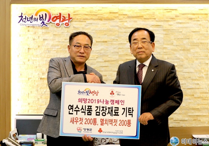 영광군 연수식품(대표 장원서)은 지난 12월 3일 김장철을 맞아 어려운 이웃을 위해 젓갈 400통(새우젓 5㎏ 200통, 멸치액젓 2.5㎏ 200통)을 영광군(군수 김준성)에 기탁하였다.
