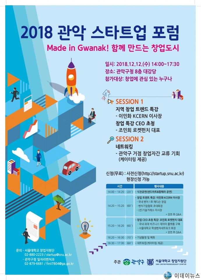 관악구(구청장 박준희)가 오는 12일(수) 14시 구청 8층 대강당에서 ‘2018 관악 스타트업 포럼’을 개최한다.