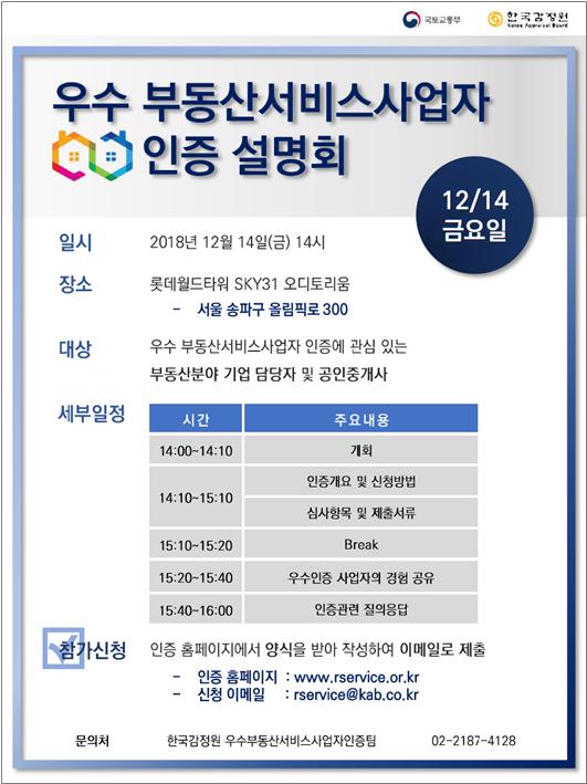 감정원 관계자는 "향후 우수 부동산서비스사업자 인증에 대한 대국민 홍보활동을 전개할 예정으로, 정부인증 기회를 발 빠르게 진행하고자 하는 부동산 분야 사업자들이 보다 많은 관심을 갖길 기대한다"고 강조했다.