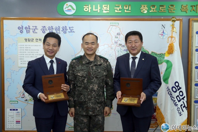 이날 김용우 육군참모총장을 대신해 소영민 31보병사단장이 전동평 영암군수와 조정기 영암군의회 의장에게 감사패를 전달했다.