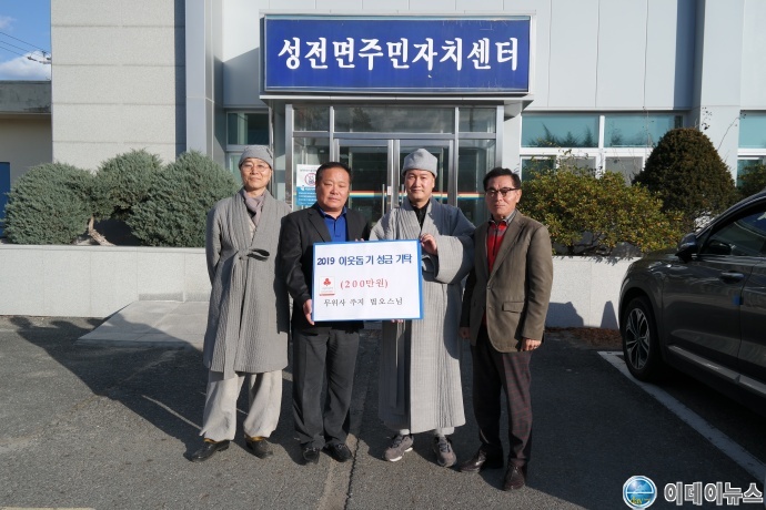 지난 18일 윤성일 성전면장은 “매년 어려운 이웃을 위해 나눔을 실천해 주신 스님께 감사드리며,사회 취약계층의 복지향상을 위해 더욱 열심히 노력하겠다”고 말했다.
