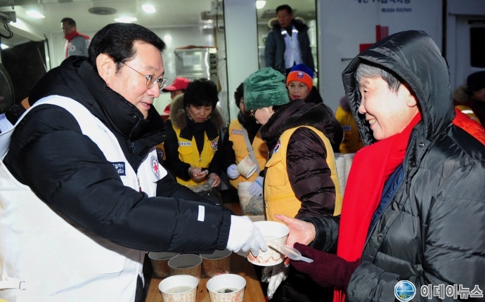 이용섭 광주광역시장이 1일 오전 동구 증심사 탐방안내센터 앞에서 열린 ‘기해년 새해맞이 떡국 나눔 행사’에서 적십자사 회원들과 함께 무등산 등반객들을 위한 떡국 배식 봉사활동을 하고 있다.