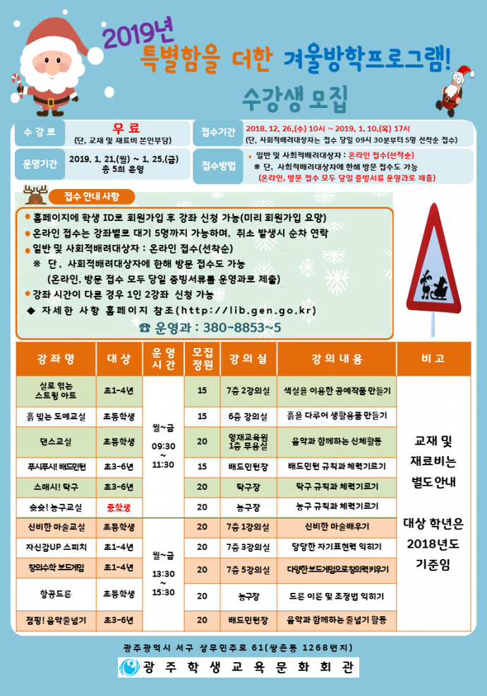 광주학생교육문화회관(관장 양주승)은 2019년 겨울방학을 맞아 초․중학생을 위한 「특별함을 더한 겨울방학프로그램」을 실시한다.