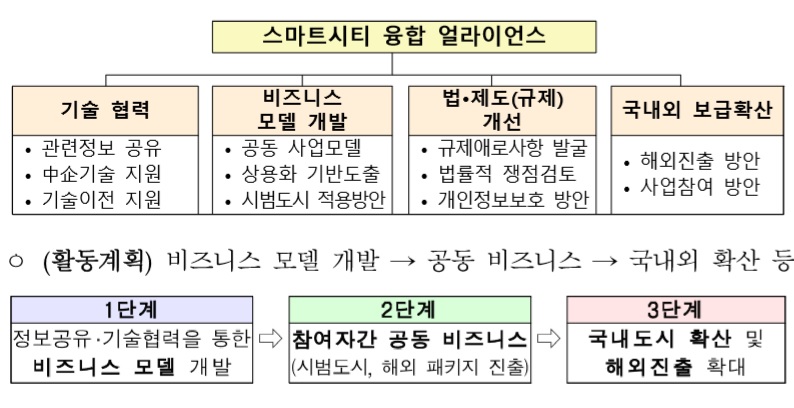 스마트시티 얼라이언스는 대ㆍ중소ㆍ새싹기업뿐만 아니라 대학ㆍ연구기관ㆍ협회 등 민간이 중심이 되는 지속가능한 스마트시티 조성ㆍ확산을 이끌 핵심 협의체이자 대정부 소통창구로서, 이종기업 간 기술협력, 사업모형(비즈니스 모델) 개발, 법ㆍ제도ㆍ규제 개선, 국내외 보급ㆍ확산 등의 분야별로 분과를 나눠 역할을 수행할 전망이다.