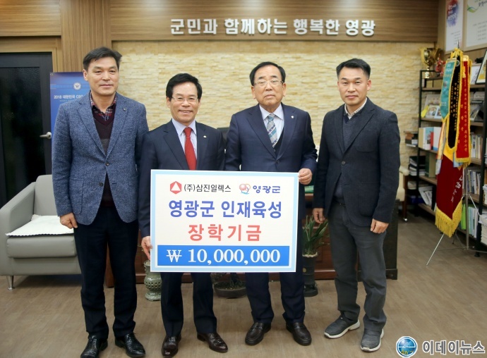 ㈜삼진일렉스 김성관 회장이 지난 10일 영광군청을 방문해 지역인재육성에 써 달라며 장학금 1천만 원을 기탁하여 지역사회에 훈훈함을 전했다.