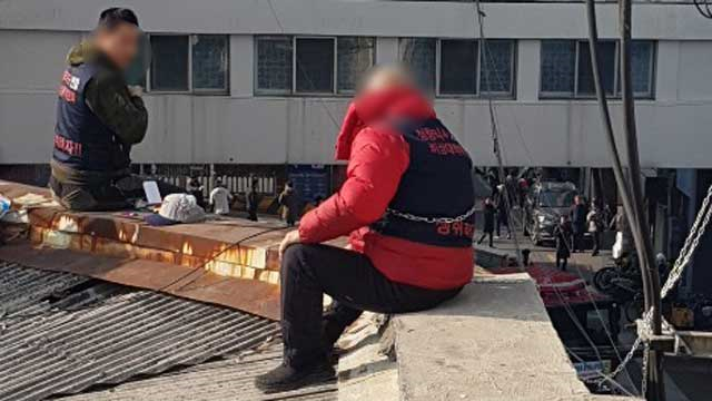 14일 오전 현재까지 옥상 난간에서 머물고 있으며, 경찰과 소방당국은 주변 지면에 에어매트리스를 설치하고 주변을 통제 중이다.