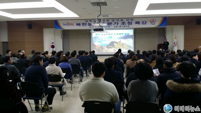 이날 초빙 강사인 이용범 교수는 북한의 식량안보, 작물별 생산현황, 농업정책 등의 북한농업의 현 주소와 대북 농업협력 20년사의 평가 및 향후 우리가 추진해야 할 과제를 던져주며 남북 농업교류에 대한 중요성을 군민과 공직자들에게 인식시키고, “대북 농업교류에 직접적인 재원이나 물자 지원보다는 우리의 농업발전 과정에 성공과 실패 경험을 공유하고 상호 신뢰를 바탕으로 한 진심을 담은 남북농업협력이 필요하다고 강조”하였다.