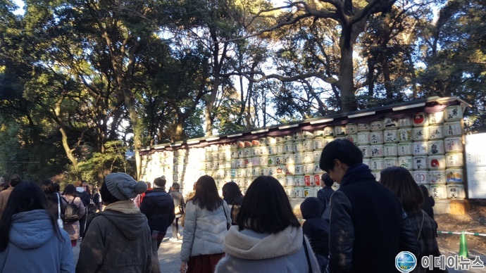 메이지 신궁 입구에서 본전으로 가는 길은 새해라서 사람들이 많다. 조금 걸어가니 길옆에 와인과 청주 통이 있다. 와인은 프랑스 부르고뉴에서 청주는 일본 양조업체에서 기증 받은 것이란다.