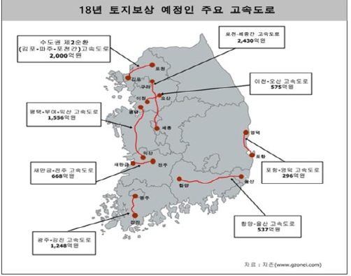 최근 부동산 업계 전문가들은 그 중 고속도로의 경우 18개 노선에서 약 9991억3200만 원의 보상이 이뤄지며, 전체 SOC 보상비의 66.7%에 달하는 규모라고 전망하고 있다. 15개 노선이 재정사업, 3개 노선이 민자사업이다.