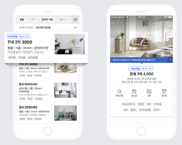 다방은 지난해 7월부터 `방주인 매물 검증 자동화 솔루션`을 시범 운영해 현재까지 총 1만여 건의 누적 확인매물 데이터를 구축했다. 확인매물은 신뢰도가 높은 매물이라고 판단, 다방에서도 최상단으로 노출해 사용자들이 서비스 내에서 우선적으로 확인할 수 있다. 확인매물은 일반매물에 비해 사용자 전화 문의도 3배 이상 많아 공인중개사들 사이에서도 만족도가 높은 편이다.