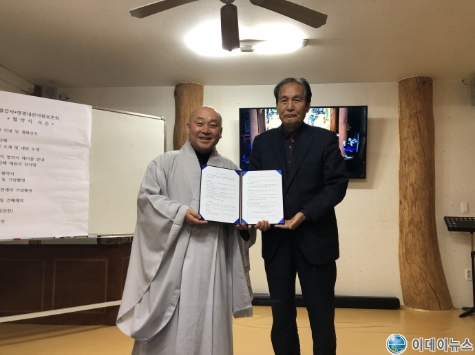 영광내산서원보존회(회장 강재원)와 대한불교 조계종 불갑사(주지스님 만당)는 지역 문화관광발전을 위해 19일(화) 오후 2시에 전남 영광군 소재 불갑사에서 만당스님의 업무체결 선언으로 MOU 업무협약식이 양측 관계자 10여명이 모여 진행됐다.