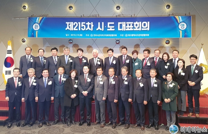 전국시군자치구의회의장협의회(회장 강필구)는 2019. 2. 19.(화) 대구 중구 소재 노보텔 엠버서더에서 15개 시도대표회장 환영식 및 제215차 시도대표회의를 개최했다.