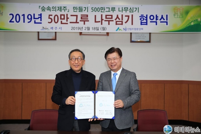 산림조합중앙회(회장 이석형)는 2019년 2월 18일(월) 제주시청 회의실에서 '숲속의 제주' 만들기 500만 그루 나무심기 프로젝트를 성공을 위한 상호협력과 쾌적한 제주 환경 만들기를 위한 협약을 맺었다.